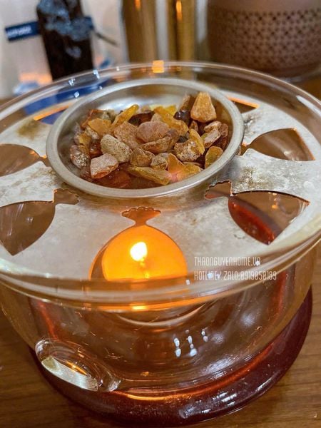 4. Để 1 ít vào cái bếp xông nến bơ, có cái đĩa nhỏ kim loại thì để lên. Mùi của hổ phách khi làm bài này không nồng nặc như hương liệu nhân tạo mà có mùi gỗ, nhựa thông và chút ngọt thanh giúp làm việc cần sự tĩnh tâm cao độ. Hoặc bạn nào muốn tăng dương mạnh hơn cả để đĩa